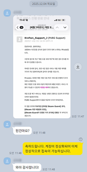 복구 대행 접수 후 게임 사 지원팀에서 답변을 받는 데 시간이 좀 걸릴 수 있는데 보통 영업일 기준으로 답변을 받을 수 있기에 저희는 이 지원팀에서 얼마나 빨리 답변할지는 정확히 알 수 없습니다.